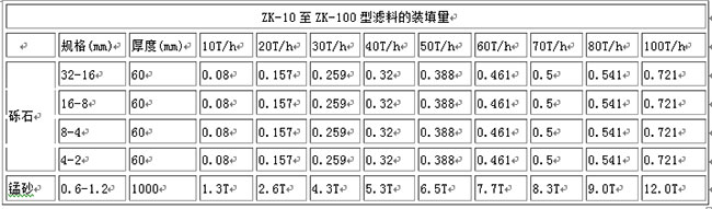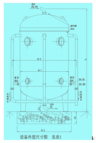 濾層厚度:1.0-1.2m; 進口壓力≧0.06Mpa; 設備承受壓力:0.06-0.3Mpa、0.3-0.6Mpa、0.6-1.0Mpa。